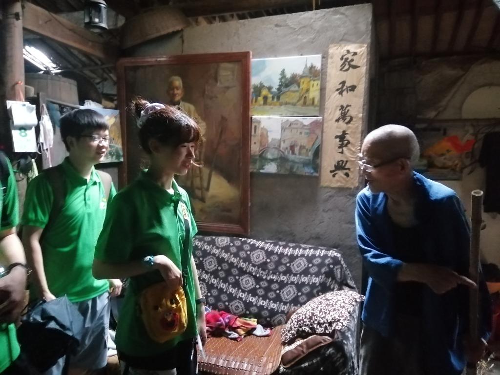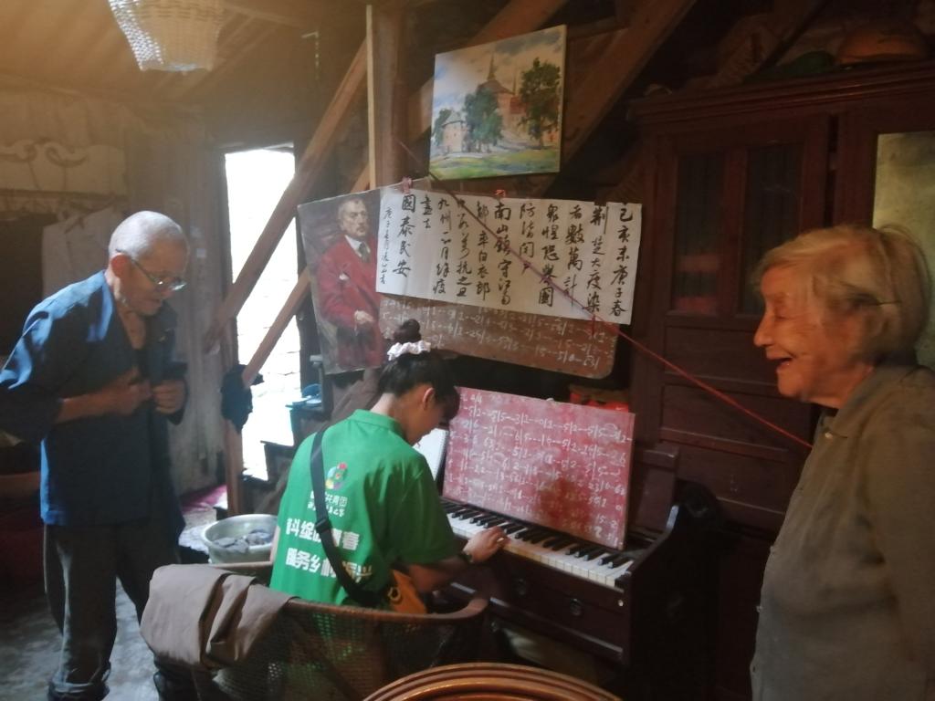 经过中午的短暂休憩后,实践团队进行更深入的村民走访和实地考察。在一棵古树旁遇到一位乘凉的老人,与他进行一番交谈过后,热心的老人邀请团队成员进入屋内做客,屋内有琳琅满目的油画卷,还有一架陈旧的老式电子琴。老人为实践团队弹奏了鼓风琴、展示了字画、讲述了油画的来历——原来这位老人已经92岁,这些油画都出自他的孙女之手,他的孙女也是一名在职教师。上凌村对文化的热爱历经三代,依然薪火相传,生生不息。