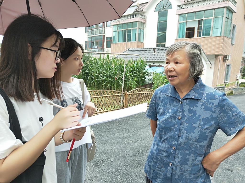下午,成员们分成三队,进行调查问卷的发放。成员们以村委会为中心,分别从三个方面展开活动,通过问卷调查,成员们了解了上田村近年来的文化建设情况,倾听了村中老年人对上田村文化建设的感想和理解,并在走访过程中询问农户的家训家规,感受其中的文化魅力。随后,成员们返回村委会,并对上田村党支部书记潘曙龙进行采访。成员们以乡村文化振兴为主题向他提出询问,潘曙龙书记说道:"文化建设主要在于传承,要用文化引领文明,要用文化的生命力带动经济发展。”潘书记的一番话令群成员意识到上田村俨然成为了一个社会主义新型乡村,政府部门的工作为本村经济文化稳健发展做出了很大的贡献。