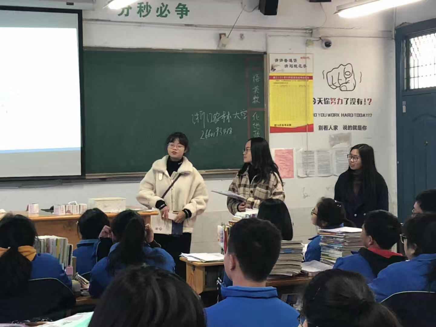 在本次活动中,无论是从统筹策划还是到细节落实,团队的每位成员都付出很多心血。他们首先通过摆摊宣传,解答学弟学妹们提出的各种问题;然后进行走班宣传,用ppt的方式讲述学校概况、招生概况以及学校食堂寝室等硬件设施情况。最后团队成员们向母校学子分发招生宣传简章和精美的书签、明信片等,鼓励学弟学妹积极关注和报考浙江农林大学。