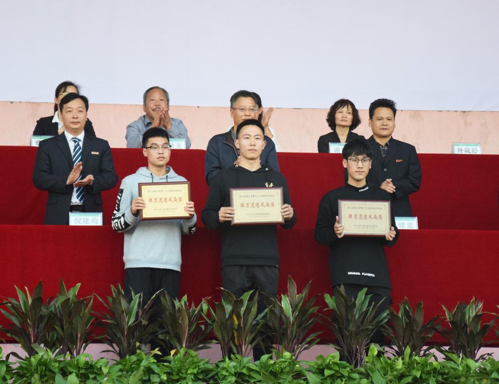 下午四时许,运动会闭幕式按时举行。闭幕式上,各方阵有序退场,学校领导公布了本次运动会各学院的团体总分以及名次。其中,6165cc金沙总站检测中心以优秀的竞技品格以及良好的精神风貌获得了“体育道德风尚奖”,农林经济管理专业的钱如鑫同学凭借出色的成绩获得了“优秀运动员奖”。