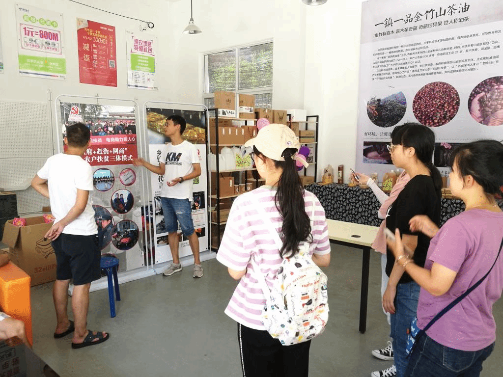 根据金竹镇团委书记对产品的介绍,实践团成员们了解到金竹镇的电商探索发展目前进入了第三阶段,利用“政府+赶街+网商”的中小农户扶贫三体模式,依靠赶街公司的专业团队控制预算、设计包装,通过线上广阔的平台和渠道来销售农产品。同时,政府还开启了“扶贫众筹”项目,政府统一从每家每户收取一定数量的山茶籽,运送至工厂加工,最后出了山茶油成品,由乡镇书记亲自代言推广,运用网络程序进行众筹销售。