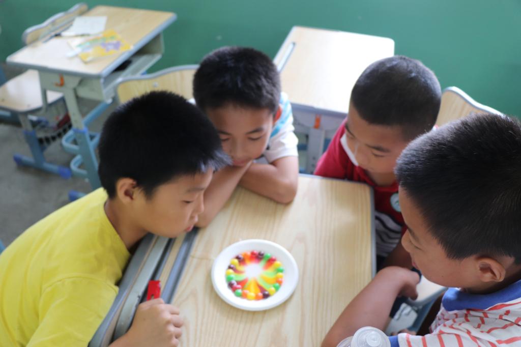 2018年7月16日,支教生活已经进行到了第八天。这天,清脆的鸟叫声与孩子们千字文、三字经的朗朗颂读迎来了新的早晨。上午,实践团成员开设了科学实验课和书硬笔法课。在科学实验课上,孩子们见证了一场彩虹盛宴。看着普普通通的彩虹糖在老师的手中变成了缤纷的彩虹,一个个科学梦也悄悄地种入了他们的心中。孩子们根据老师的讲解,按照步骤分组实验,如愿看见了美丽的彩虹。接下来的书法课更是让孩子们见识了中国书法的奥妙。他们在认真练字的同时积极与老师互动,他们不再将写字当作一种负担,而是把写字看作一种展现自己的方式。这种思想上的改变会给他们的未来带来更多积极的影响和更多的可能性。