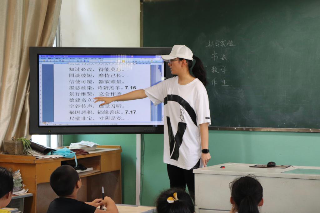下午,实践团成员开设了趣味数学和作业辅导课。在这天的趣味数学课堂上,实践团介绍了无限纯循环小数和无限混循环小数如何化成分数。一开始,同学们百思不得其解,后来在老师的指导下,他们逐渐掌握了化成分数的规律,并能够熟练使用这种方法。这种新奇的数学知识给学生们展现了一个更广阔,更奇妙的数学世界。随后,实践团就孩子们带来的暑假作业开启了作业辅导课, 实践团成员们帮忙解惑答疑,小学生们在认真写作业的同时积极问老师问题,班里的学习氛围十分浓厚。