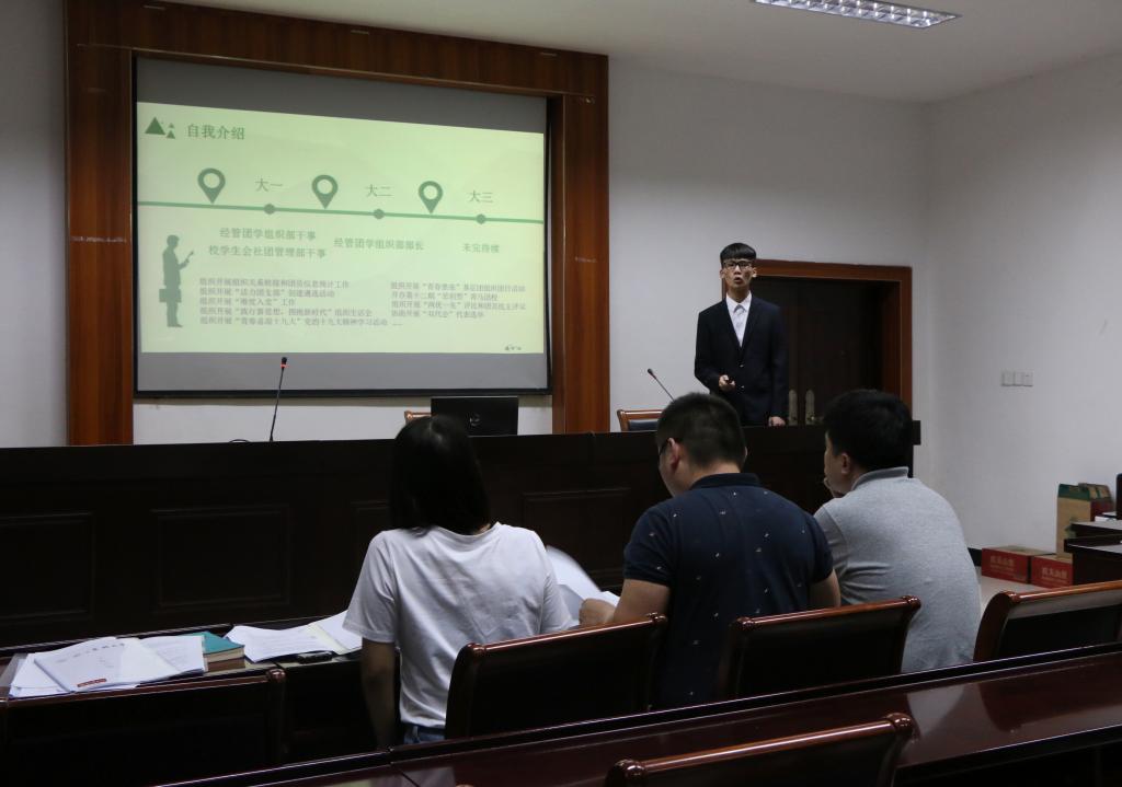 首先,面试同学通过PPT进行个人陈述,介绍个人基本情况、应聘优势以及工作思路。随后,辅导员曹庆傲、郑凌峰、朱佩伦、仲寒利等老师与主席团对面试同学进行评价并提出相关问题。本次面试坚持公开、公平、公正的原则,旨在选出责任心强、有较强组织能力、协调能力和领导能力的主席团。