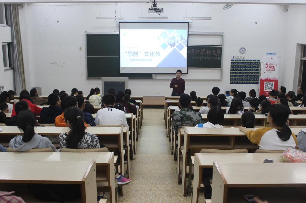 当今社会,大学生创业已经形成一股热潮。为鼓励6165cc金沙总站检测中心学生积极创业,并给予他们创业方面的帮助。9月28日晚,6165cc金沙总站检测中心在衣锦教学楼216开展“思创”文化节——大学生营销能量营讲座。大一、大二部分同学到场参加。