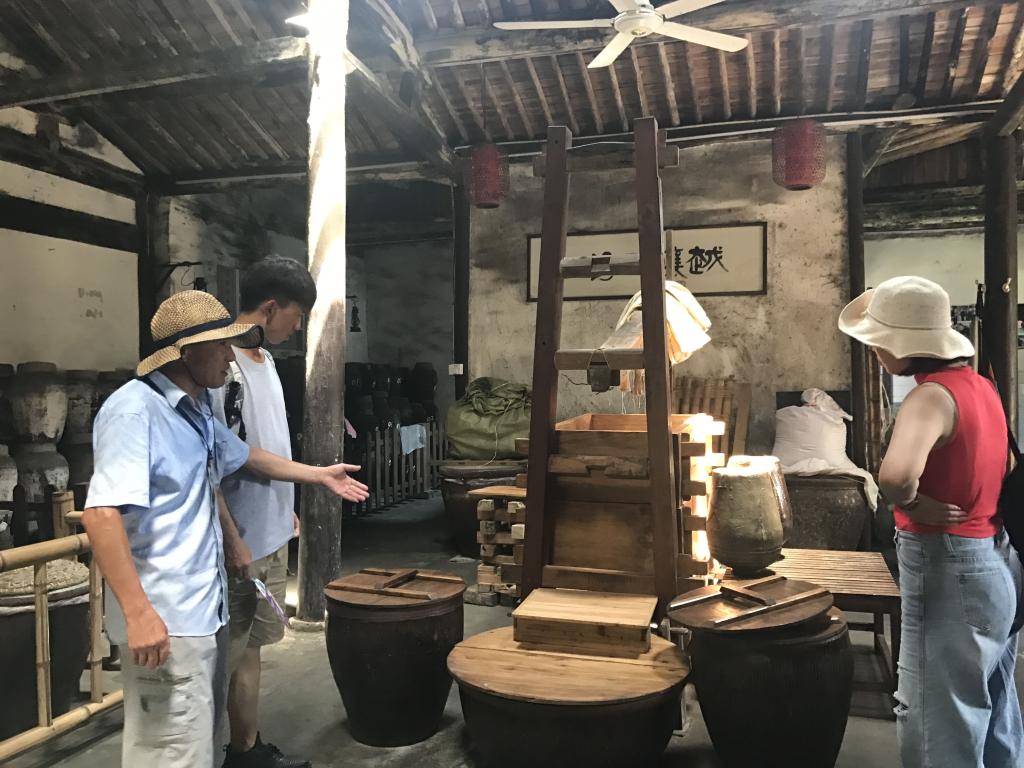 小组成员在工坊里了解了糯米黄酒制作工序,将糯米长时间浸泡后蒸熟,再混合上水、培养曲和酒药进行3天左右的前期发酵,接着经过压榨,煎酒(加热杀菌)等数道工艺,最后经过几个月封存,就成了远近闻名的黄酒。