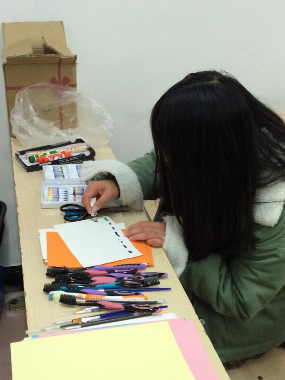 志愿者们学院楼前集合听取青志部干事对活动安排的介绍之后,各自组队纷纷行动起来,开始紧张有趣的寻找秋叶活动,为后阶段的秋DIY做好充分准备。志愿者们每弯腰捡拾一片片叶子都异常认真专注;当他们审视叶子的色泽纹理时也是那样的细致入微;在终于找齐原材料满载而归时脸颊盈满笑意。在这个寒气凛冽的初冬,这些简单的活动细节都让人也感受到无尽的温暖。准备完毕后的秋叶手工开启了这场暖心之旅的高潮。志愿者小组各自在纸上用秋叶作画,寒冷并没有锁住他们独特的构思和灵巧的双手,画笔、剪刀、颜料轮番上演,完成一个个充满诗意的奇迹——金鱼灵动可人、草莓小巧精致、兔子栩栩如生。