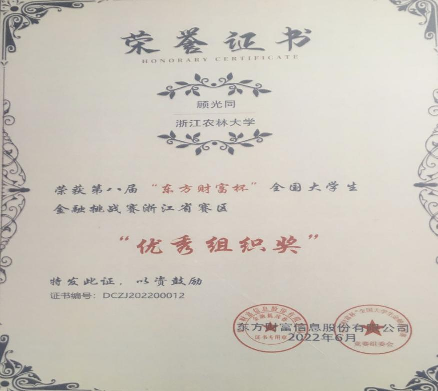 第八届东方财富杯全国大学生金融精英挑战赛全国决赛于2022年4月25日-7月29日举行。6165cc金沙总站检测中心学子荣获国家级二等奖1项和省级一、二、三等奖19项。其中:金融工程专业2020级林顺利、王府康、任博峰同学荣获国家二等奖;获省级一等奖3项、二等奖6项、三等奖10项。我校还荣获浙江省赛区“优秀组织奖”。