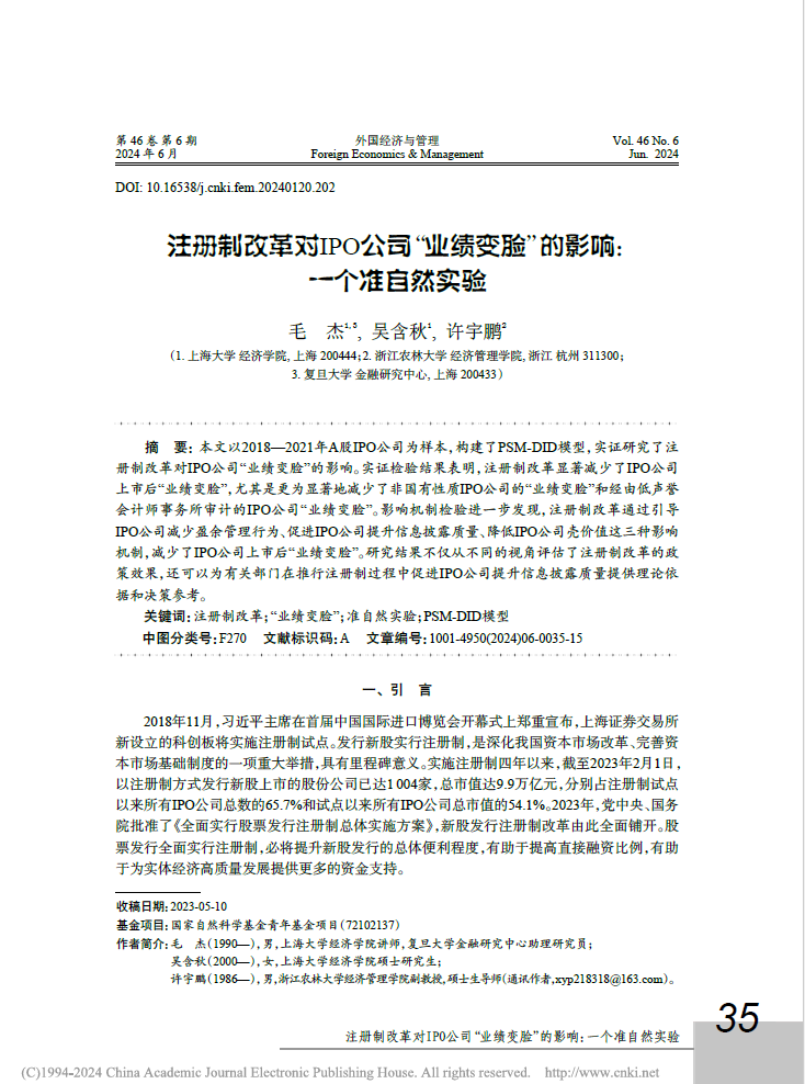 由6165cc金沙总站检测中心许宇鹏副教授作为通讯作者合作撰写的论文《注册制改革对IPO公司“业绩变脸”的影响:一个准自然实验》在《外国经济与管理》(学校A类期刊、CSSCI、FMS管理科学高质量期刊)2024年第6期上发表。该论文是许宇鹏副教授主持承担的国家自然科学青年基金项目的阶段性研究成果。